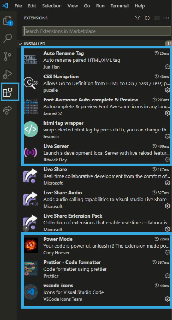 시작하기 앞서 작업 속도를 높여 줄 수 있도록 확장 기능을 설치하겠습니다. 왼쪽 끝에서 5번째 아이콘을 누르면 확장 기능을 검색해서 install할 수 있습니다.