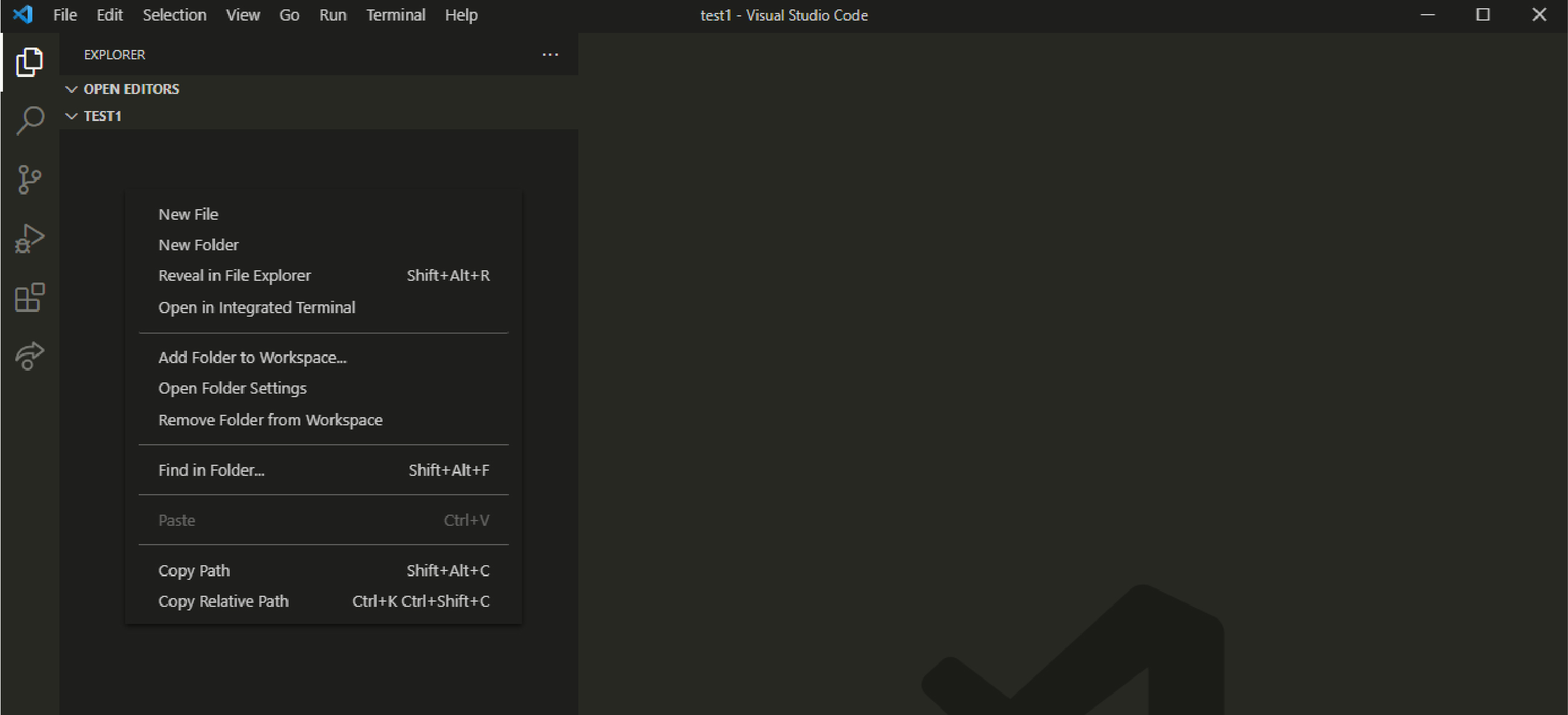 - 상단의 File > Open Folder 선택해 창이 열리면 폴더를 새로 만들고 (이름은 상관없습니다) 선택해 열어줍니다.