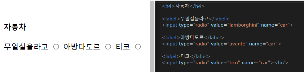 여기서 잠깐! checkbox와 radio의 차이점이 무엇일까요? 모양이 다르다일 수도 있지만 checkbox는 여러 항목을 선택할 수 있지만 radio는 한 가지만 선택할 수 있다는 것입니다. 그래서 radio같은 경우 뒤에 name값을 동일하게 지정해줘야 여러 항목이 체크되는 오류를 막을 수 있습니다. name="네임값" 이라고 입력하면 됩니다. 저 같은 경우 name값에 'car'를 넣어줬습니다.