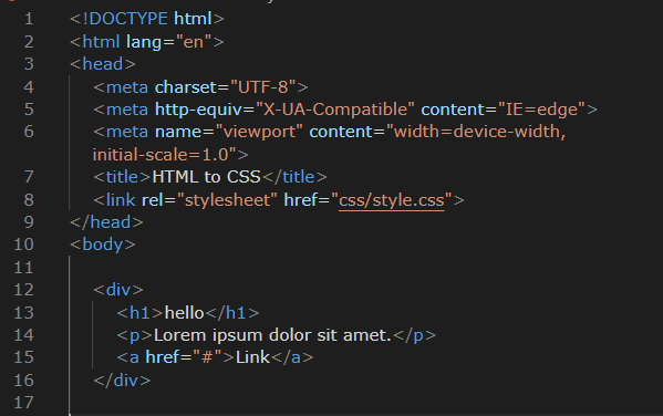 먼저 CSS파일을 생성해주고 HTML파일의 head 태그 안에 <link rel="stylesheet" href="css/style.css">를 기입합니다. link라는 단어만 적고 enter치면 자동으로 기입될거고 href에는 방금 만든 CSS파일 이름을 적어주면 되는 것입니다. (저는 CSS 폴더 안에 style.css 파일을 만들었기 때문에 "폴더명 + /(슬래시) + 파일명" 형식으로 기입했습니다.)