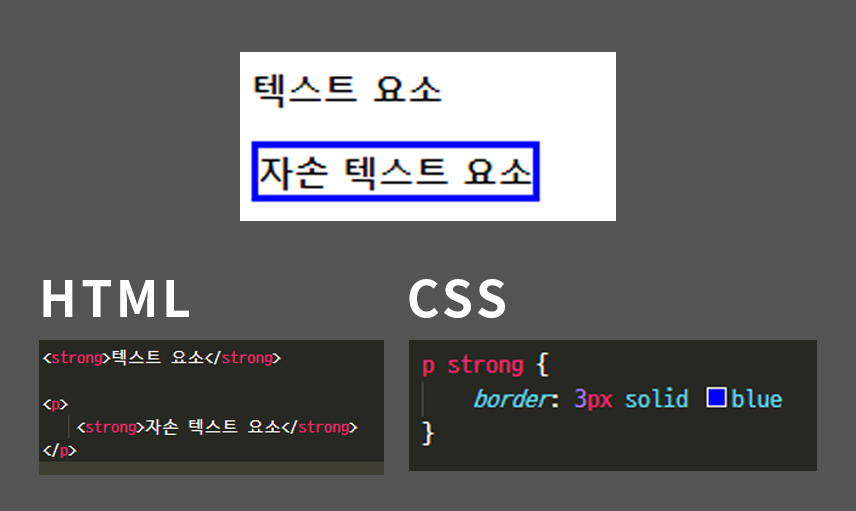 특정 HTML 요소의 자식 요소를 포함하여 그 하위에 있는 모든 요소를 선택하는 스타일을 부여할 수 있습니다. <strong>요소 중에서도 <p>밑에 있는 <strong>을 선택하라는 뜻으로 부모태그 + 자손태그 순으로 선택자 자리에 적으면 됩니다.