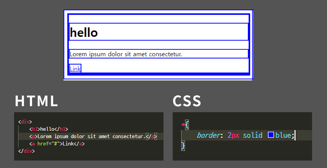 위 쪽에 있는 이미지가 출력된 화면입니다. 보는 것과 같이 border(테두리)는 2px로, 파란색의 실선을 사용하라는 속성을 부여했습니다. 화면에서는 body까지 포함한 모든 요소들의 테두리가 쳐져 있는 것을 확인할 수 있습니다.