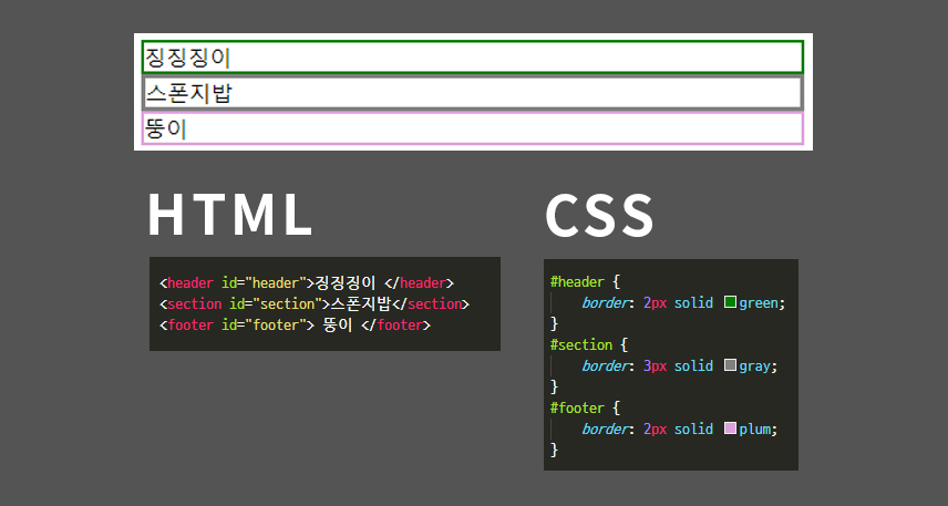 마찬가지로 id 선택자도 이렇게 구문을 적어주시면 됩니다. 다른 점은 CSS에서 . (온점)이 아닌 # 으로 id를 지정해줘야한다는 것입니다.